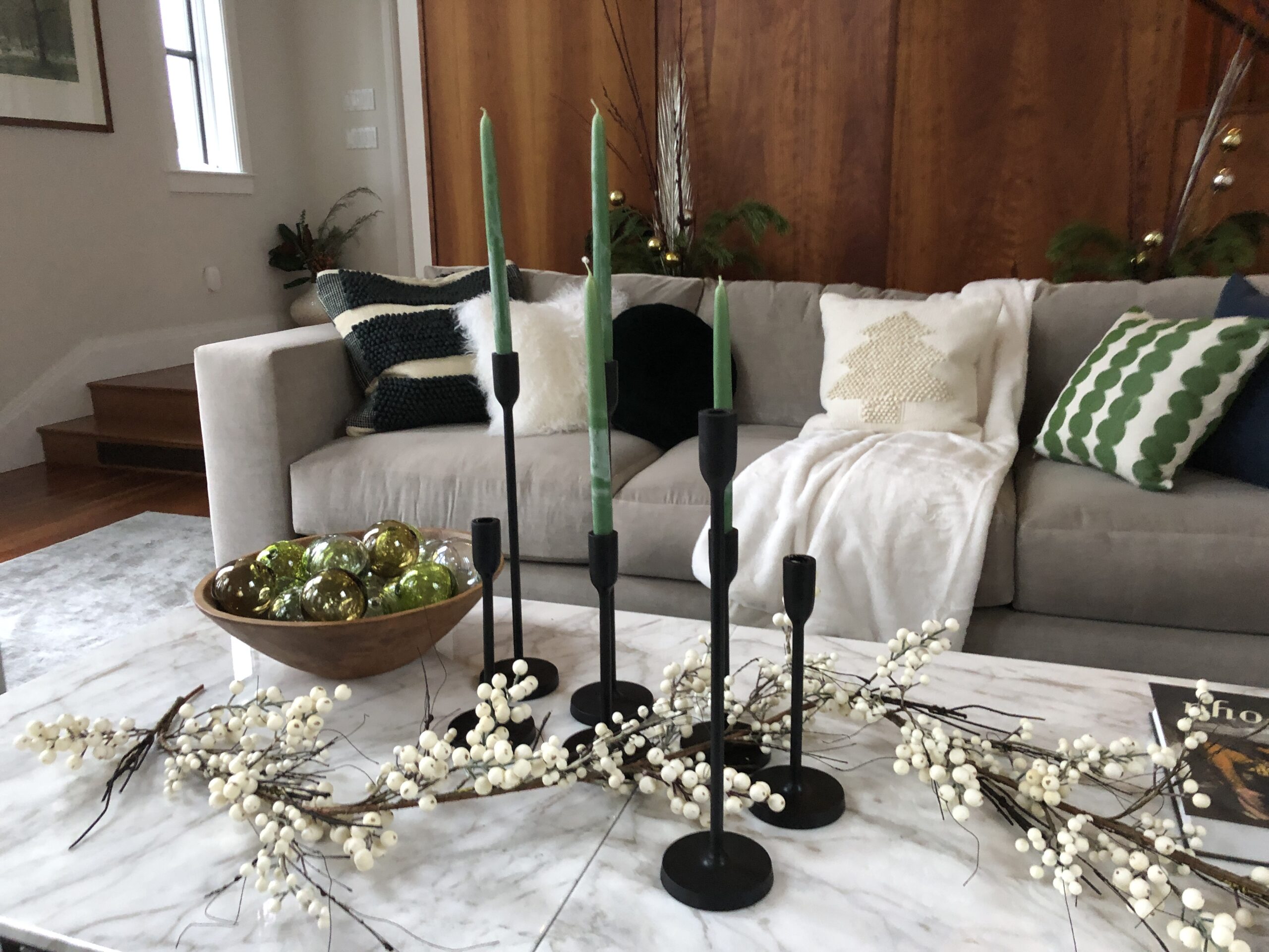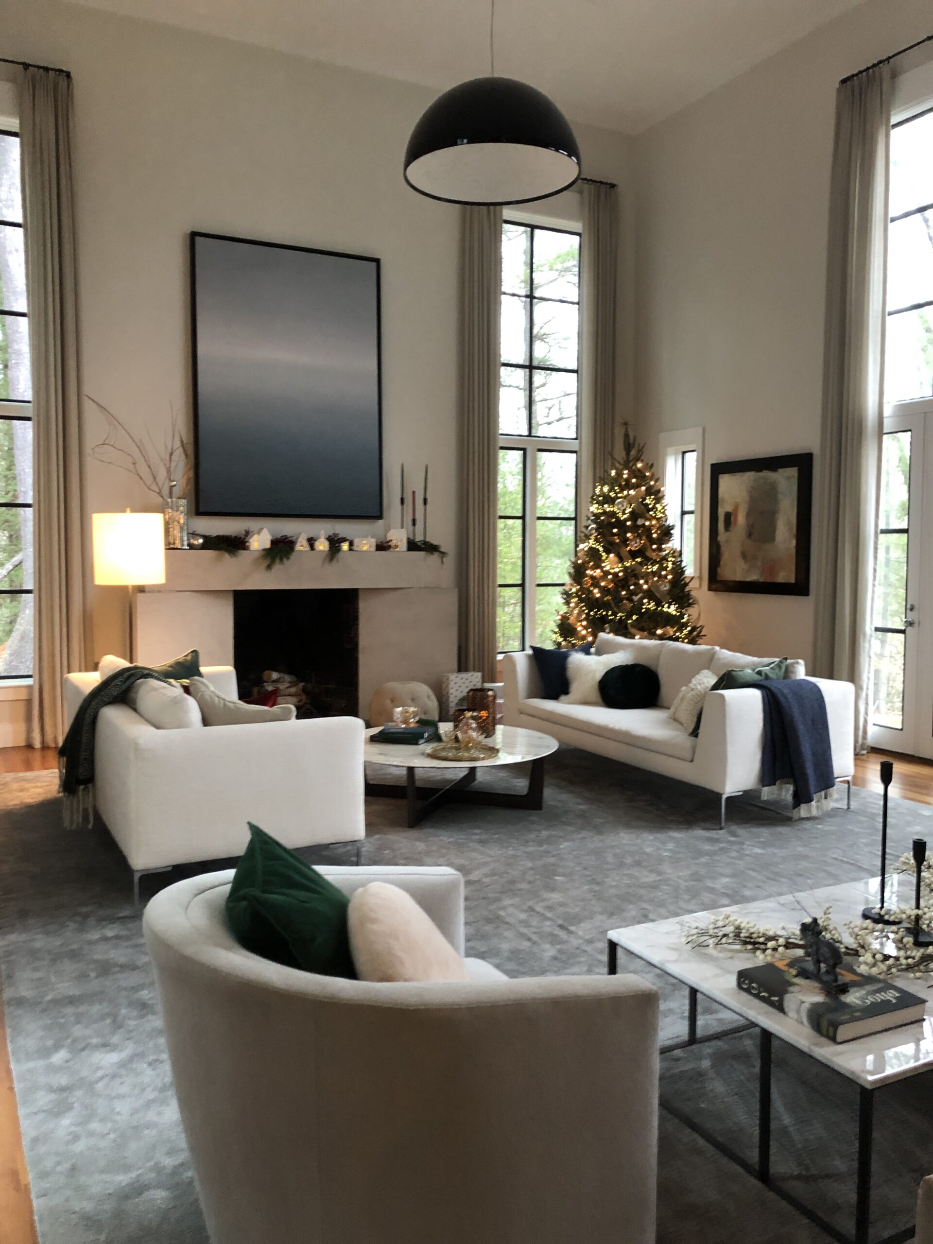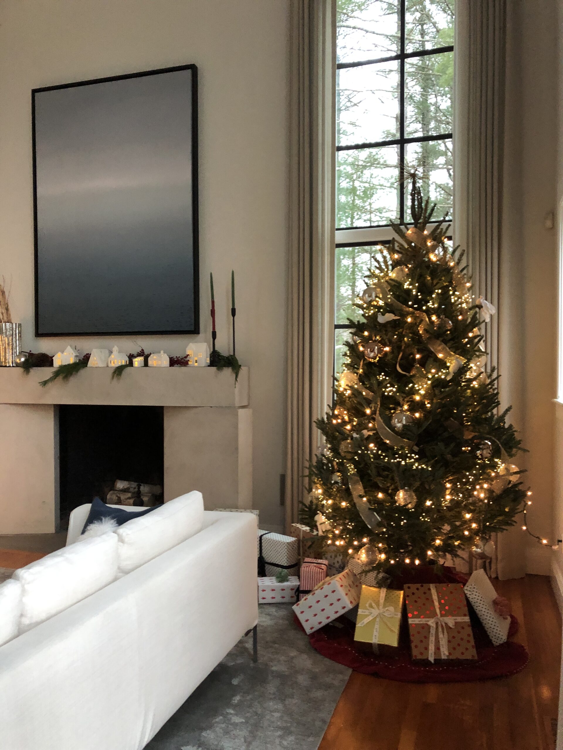After this initial step, our team had to gather lots of festive accessories, art, decorative lights, Christmas trees, and loads of greenery and branches. Styling a space is all about layering. We worked with the homeowner to harmonize with their modern aesthetics and not fight against it. We spent a few days per week experimenting with our decor items, our car filled to the rim.